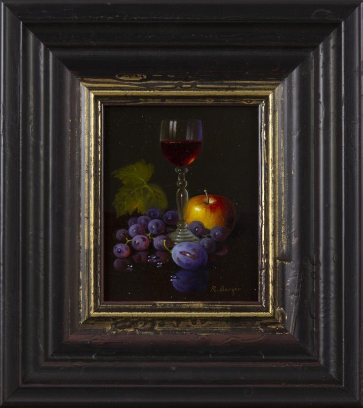 Dielo zachytáva tradičné zátišie s ovocím a pohárom vína, vytvorené v štýle klasického realizmu, ktorý vyniká bohatou farebnosťou, detailnou modeláciou a dramatickým kontrastom svetla a tieňa. Kompozícia pôsobí ticho, sústredene a vyvážene – presne tak, ako je pre autorovu tvorbu typické.
