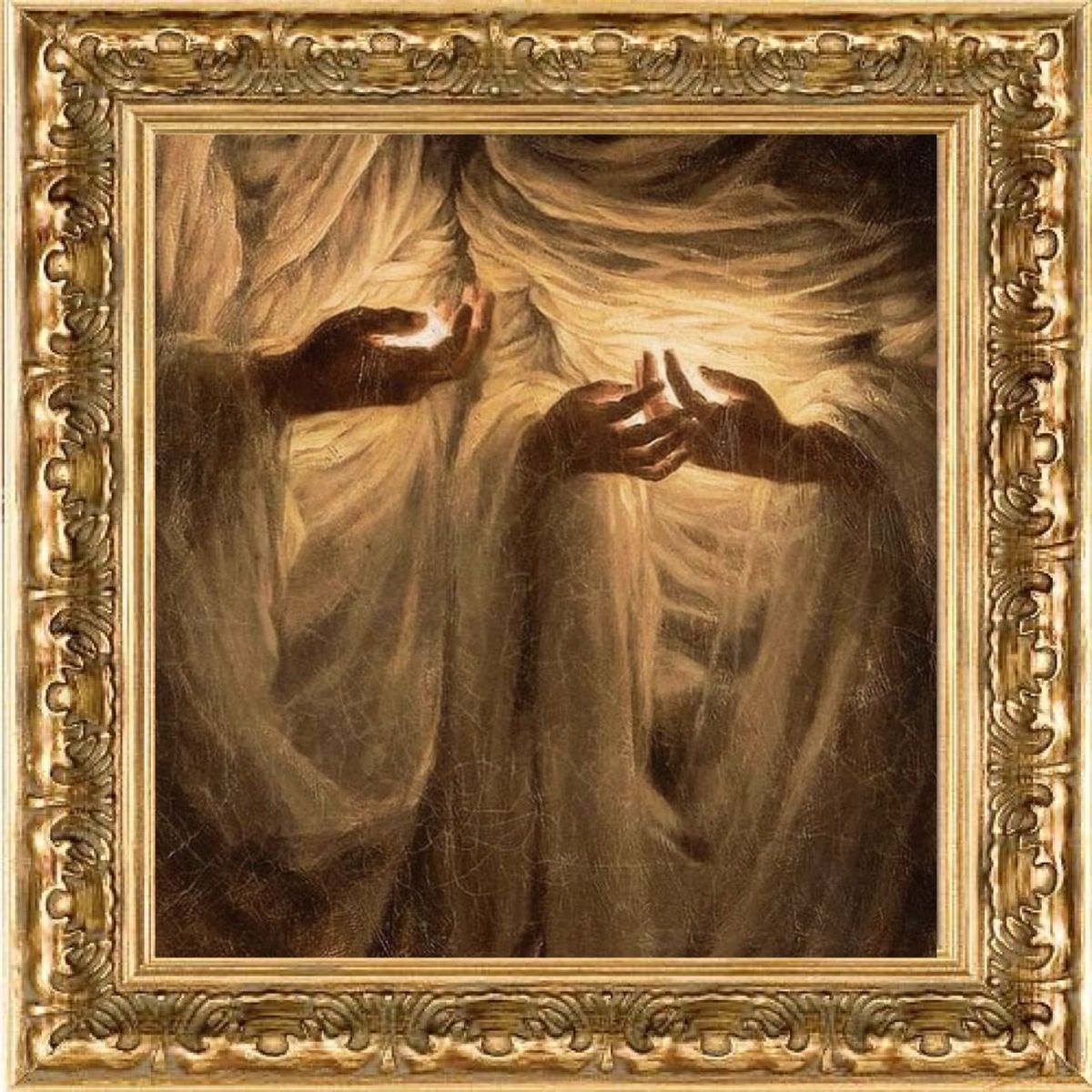 Dielo zachytáva dvojicu rúk vystupujúcich z vrstvených, závojovitých drapérií, ktoré akoby samy vydávali jemný žiar. Tento efekt vytvára intímnu, takmer posvätnú atmosféru, v ktorej dominuje myšlienka vnútorného daru, dotyku a duchovného prebudenia. Maľba je príkladom mystického realizmu, kde sa reálne tvary prelínajú so symbolickým svetelným gestom.